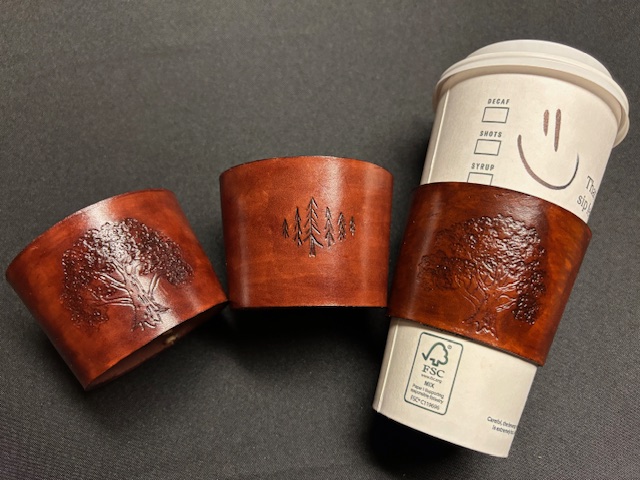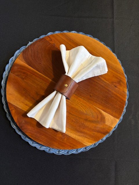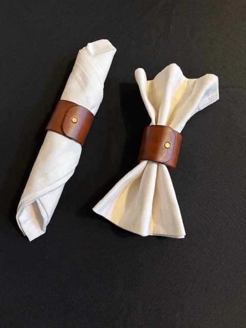 Leather Napkin Rings class up a place setting. We can make these in many colors and customize them with a small stamp like a heart, butterfly, or letters.